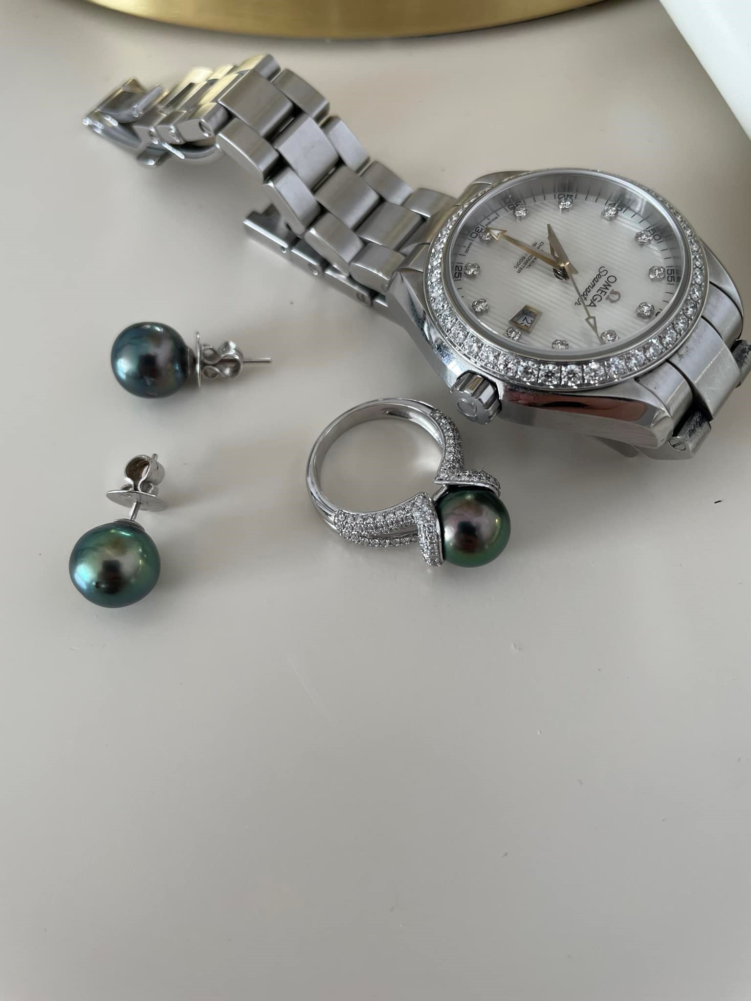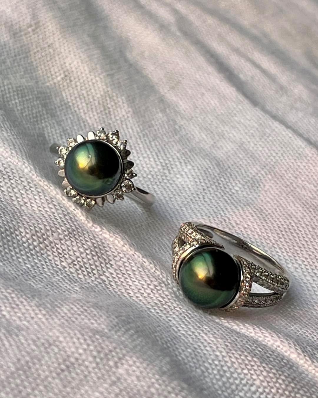 Nhẫn Ngọc Trai Tahiti Xanh Lông Công Top Gem 9mm Ổ Vàng Gắn Đá Lấp Lánh