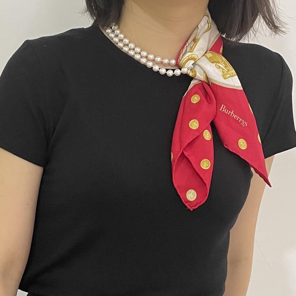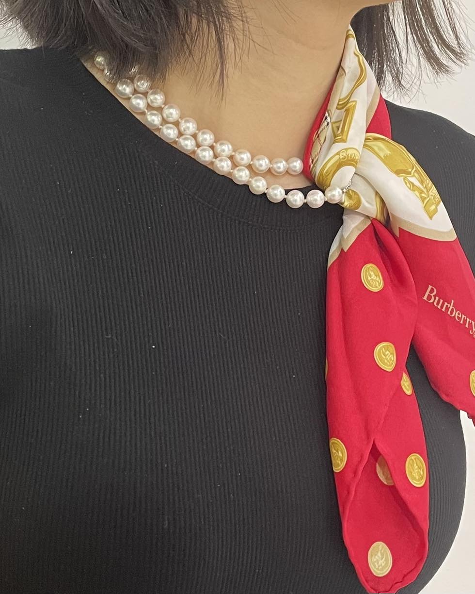 Một cách tuyệt vời để kết hợp vòng cổ ngọc trai là đeo nó cùng với khăn quàng. Khăn quàng, với những màu sắc và hoa văn đa dạng, không chỉ tạo điểm nhấn cho trang phục mà còn tạo nên sự phá cách và sự tự tin.