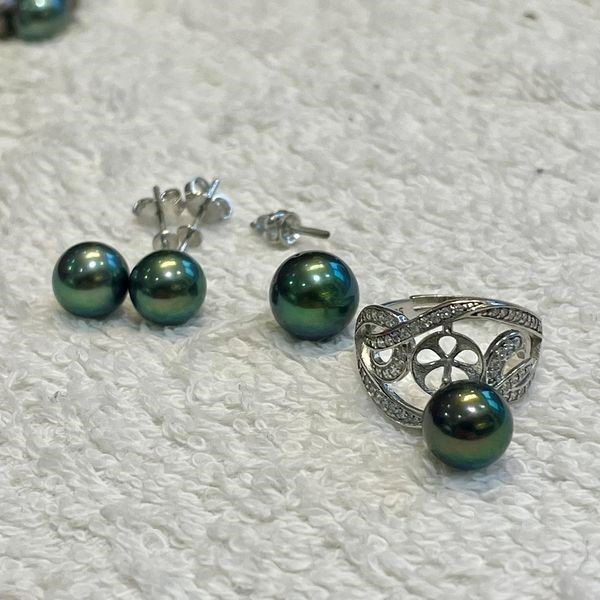 Bộ trang sức ngọc trai Tahiti ánh xanh lông công