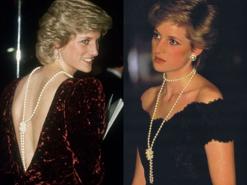 Vòng ngọc dài từng được công nương Diana biến tấu linh hoạt, khoe trước ngực hoặc sau lưng với nhiều kiểu trang phục.